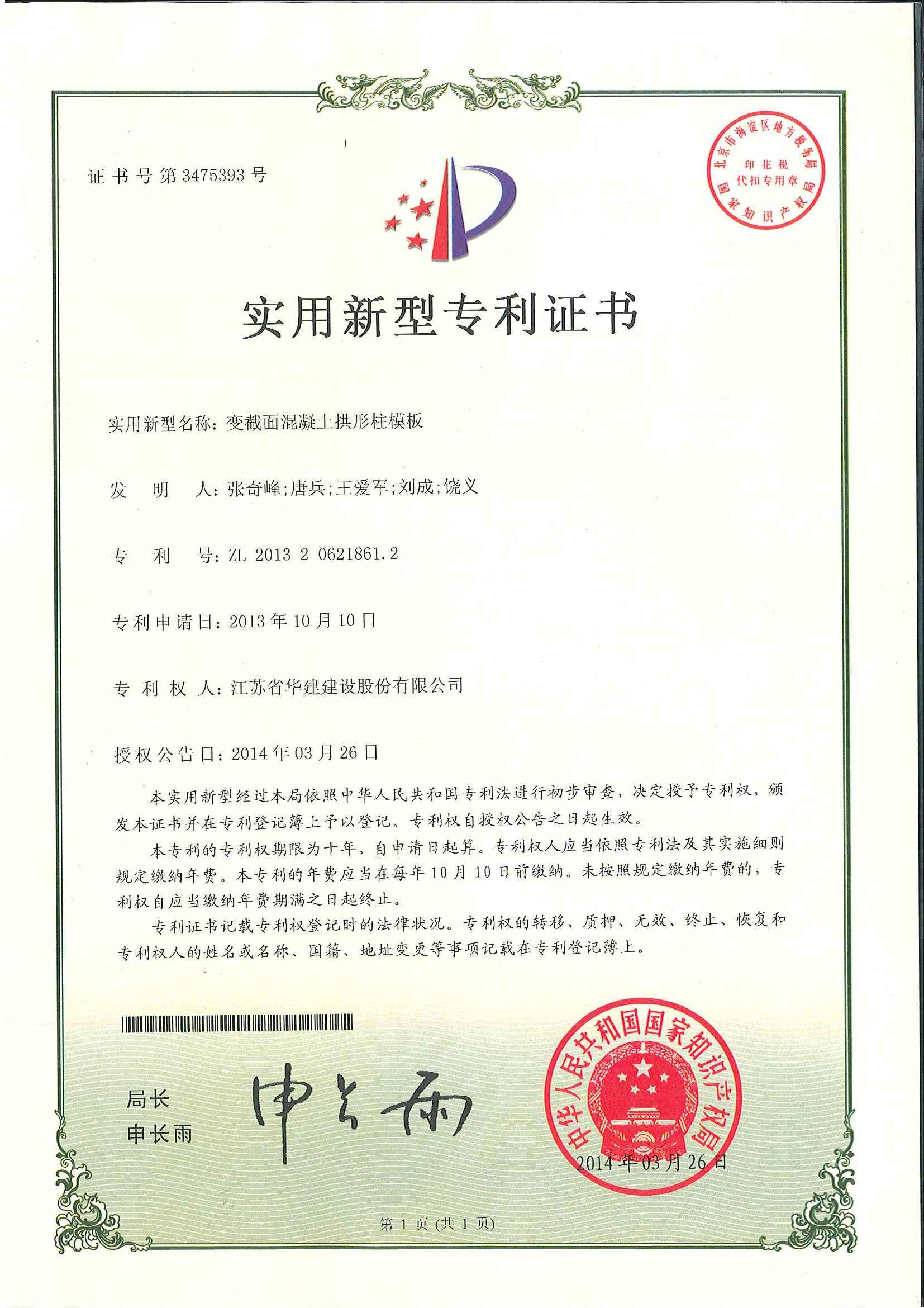 近日,公司从国家知识产权局收到3份实用新型专利证书,授予公司3项创新技术“实用新型专利”称号。它们是:《变截面混凝土拱形柱模板》(发明人:张奇峰、唐兵、王爱军、刘成和饶义)、《异形建筑施工电梯》(发明人:朱涛、钱秀雷、樊国德、李建华和刘维坤)和《一种用于圆锥台造型建筑的玻璃幕墙》(发明人:陈伟、施高成、卞晓祥、陈元和苏晨)。