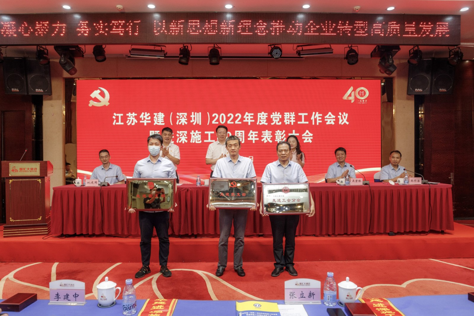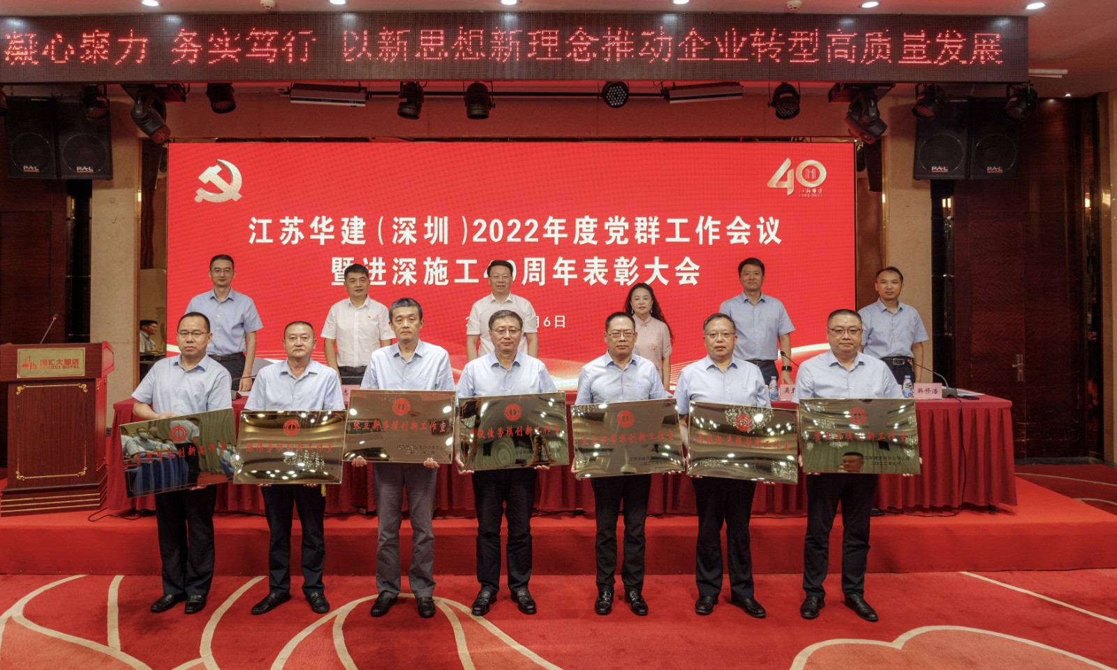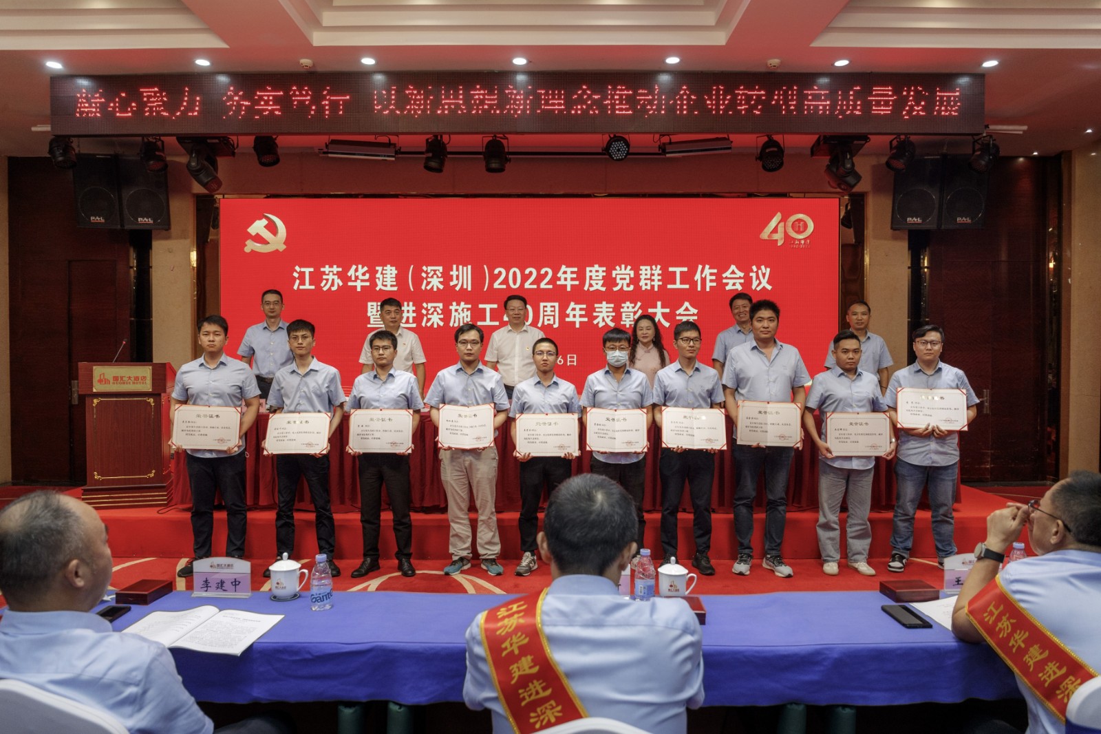 吴碧桥宣读了《关于表彰江苏华建进深施工40 周年杰出贡献奖和先进个人的决定》。《决定》指出,2022年是江苏华建成立40周年暨进深施工40周年。40年来,一代代华建人扎根深圳特区沃土,把握改革发展机遇,披肝沥胆,风雨兼程,锐意进取,砥砺前行,以奋勇拼搏的精神,一往无前的气概、坚忍不拔的意志和创造精品的信念,在深圳建起了一项项精品,树起了一座座丰碑,创造了功勋卓著令人瞩目的辉煌成就。《决定》号召,公司广大员工要大力传承和发扬江苏华建40年的优秀传统文化,虚心汲取几代华建人创造的历史智慧和精神力量,团结一致,奋发有为,新征程策马扬鞭,新时代再谱新篇,为公司高质量发展继续做出新的更大的贡献,以优异的成绩迎接党的二十大胜利召开。